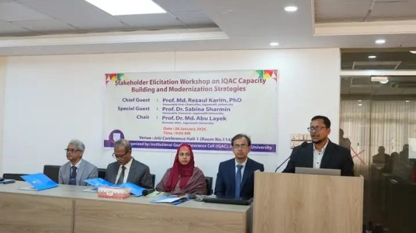 জবি প্রতিনিধি জগন্নাথ বিশ্ববিদ্যালয়ের (জবি) ইনস্টিটিউশনাল কোয়ালিটি অ্যাসুরেন্স সেল (আইকিউএসি)-এর উদ্যোগে স্টেকহোল্ডারদের নিয়ে ‘আইকিউএসি ক্যাপাসিটি বিল্ডিং অ্যান্ড মর্ডানাইজেশন স্ট্র্যাটেজিস’ শীর্ষক দিনব্যাপী শিক্ষামূলক কর্মশালা অনুষ্ঠিত হয়েছে। বুধবার (২৮ জানুয়ারি ২০২৬) বিশ্ববিদ্যালয়ের