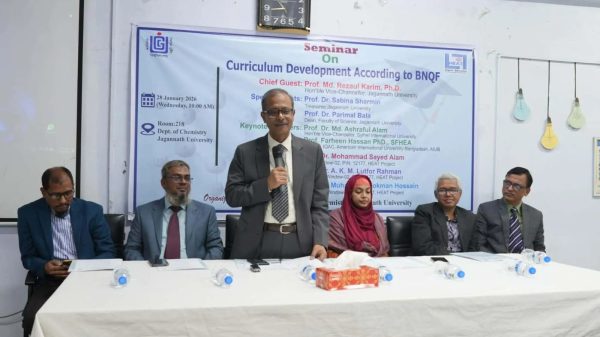 জবি প্রতিনিধি জগন্নাথ বিশ্ববিদ্যালয়ের (জবি) রসায়ন বিভাগের উদ্যোগে ‘কারিকুলাম ডেভেলপমেন্ট অ্যাকোর্ডিং টু বিএনকিউএফ’ (Curriculum Development According to BNQF) শীর্ষক সেমিনারের উদ্বোধনী অনুষ্ঠান সম্পন্ন হয়েছে। বুধবার (২৮ জানুয়ারি) বিভাগীয় কক্ষে ইউজিসি’র